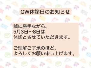 2025年GW休診日のお知らせ 2025.05.01 ホームHOME 初めての方へFIRST 医院紹介CLINIC 当院の特徴 理念・診療方針 理事長ご挨拶 院内ツアー 設備紹介 滅菌・消毒対策 スタッフ紹介STAFF 診療案内MEDICAL むし歯治療 予防歯科 入れ歯治療 小児歯科 歯周病治療 インプラント 審美歯科治療 小児矯正 成人矯正 1DAYセラミック治療 ホワイトニング デンタルエステ マウスガード レーザー治療 治療費COST 自由診療治療費 自費と保険の違い 医療費控除について 症例CASE アクセスACCESS 求人募集RECRUIT HOME ニュース 2025年GW休診日のお知らせ 5月3日(土)~5月8日(木)まで 休診とさせて頂きます。 5月9日(金)から通常診療です。 ご理解ご了承のほどよろしくお願い申し上げます。 2025.05.01 2025年GW休診日のお知らせ 2025.02.18 3月7日、8日は休診になります 2024.08.06 お盆期間中の休診のお知らせ 2023.12.26 年末年始の休診日のお知らせ 2023.04.28 GW期間の診療について 2022.08.12 お盆期間中の休診のお知らせ 2021.12.24 年末年始休診のお知らせ 2021.04.14 GWの診療に関して 2021.02.22 矯正治療の受付について 2020.12.26 年末年始の休診について